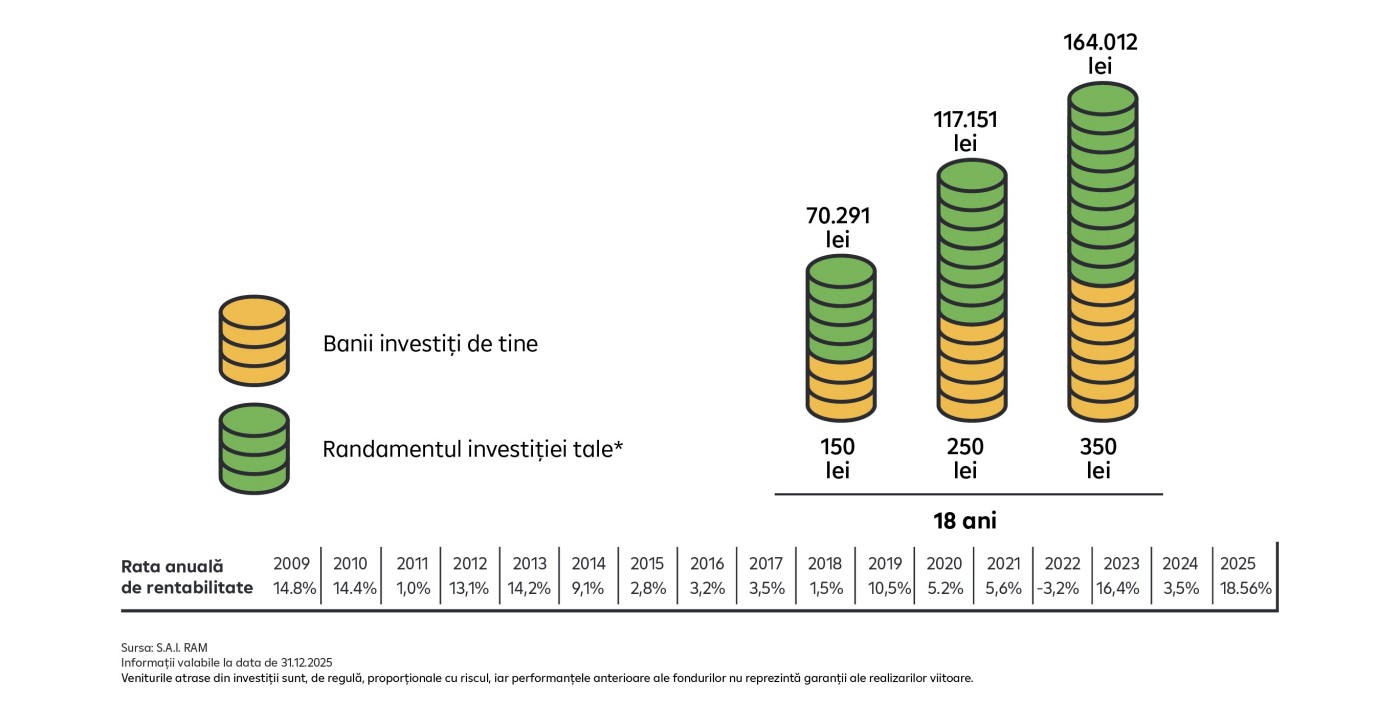 Performanțele anterioare nu reprezintă o garanție a realizărilor viitoare. Randamentul mediu ipotetic nu reprezintă o estimare sau o prognoză referitoare la performanțele viitoare ale fondului. Acesta poate suferi modificări. Citiți prospectul schemei de pensii înainte de a deveni participant. Documentele fondului pot fi consultate gratuit pe www.raiffeisenfonduri.ro.